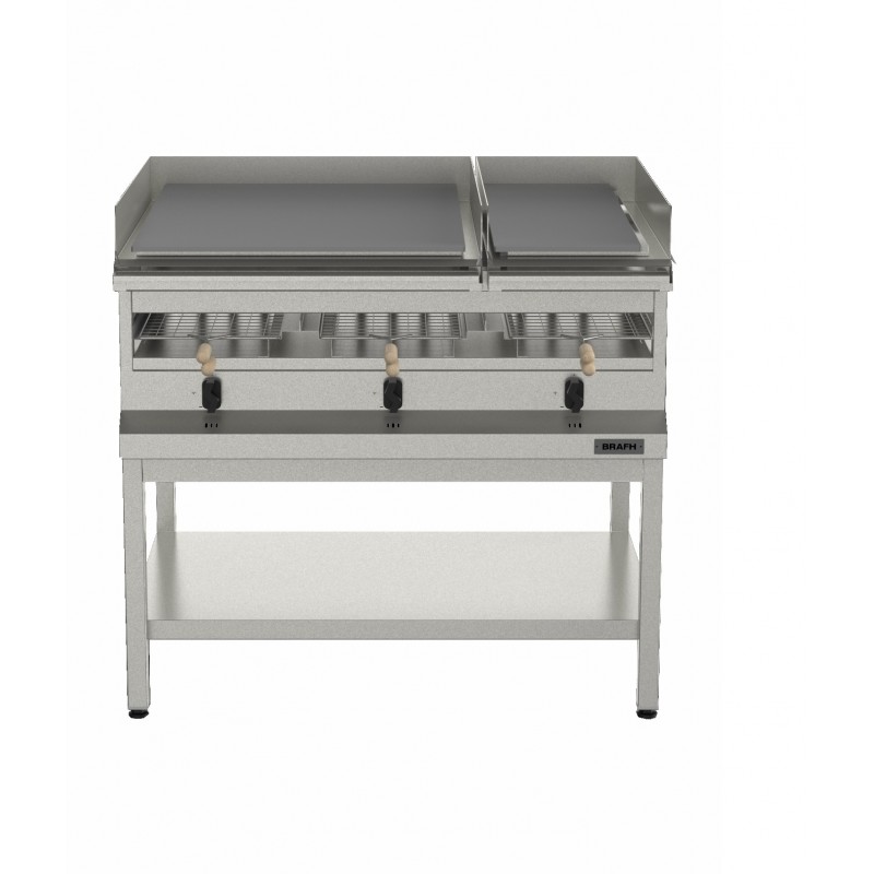 Realizado en acero inox. AISI304 o AISI430 a elección de cada cliente Plancha lisa con canaleta frontal (Espesor 10 mm) Parrila con grasera Pinzas carliteras de 270x440 mm Bandejas antiderrame de acero inox., desmontables para facilitar su limpieza Opcional: sin base, base en ac.inox. o base en ac.inox. desarmable Dimensiones: 1045x790x1021 mm