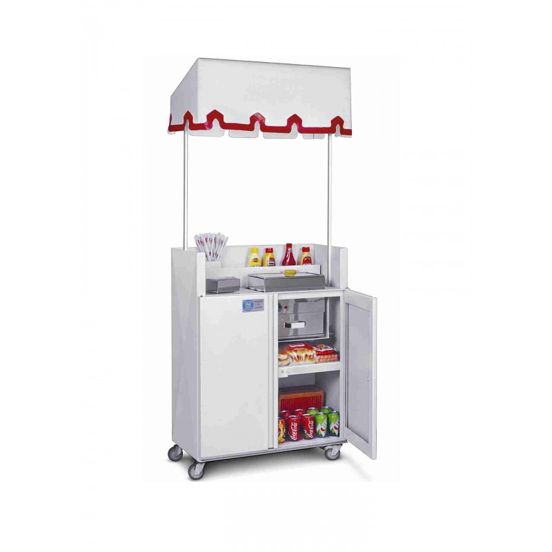 Mueble Panchero blanco construído con chapa pintada con Epoxi, equipado con 4 ruedas moviles, de las cuales 1 es con freno; 2 puertas y toldo